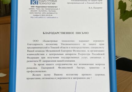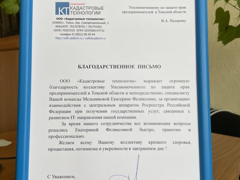 Руководитель общества с ограниченной ответственностью «Кадастровые технологии» Сергей Греченюк поблагодарил областного Уполномоченного по защите прав предпринимателей Валерия Падерина и советника бизнес-омбудсмена Екатерину Мельникову «за организацию взаимодействия с центральным аппаратом Росреества РФ при получении государственных услуг, связанных с развитием IT-направления компании».